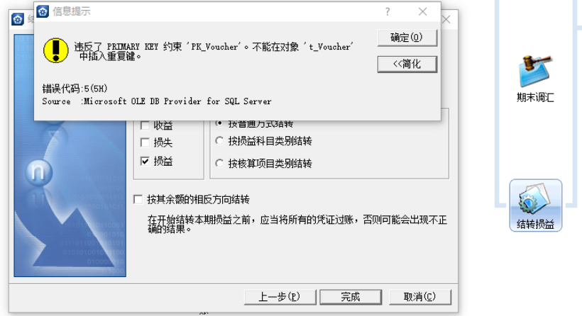 操作结转损益的时候提示:违反了 PRIMARY KEY约束’PK_Voucher’。不能在对象’t_Voucher’中插入重复键。