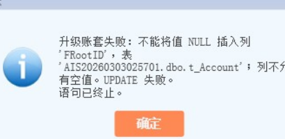 升级账套失败:不能将值NULL 插入列’FRootID,表AIS20260303025701.dbo.t_Account’;列不许有空值。UPDATE失败。语句已终止。