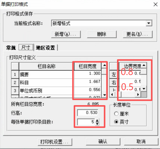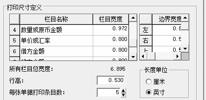 2、选择[尺寸]页签,调整合适的边界宽度即可实现打印多张凭证。