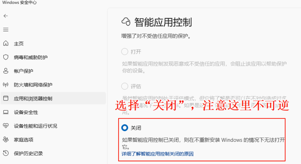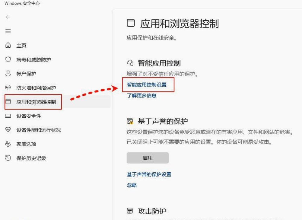 1、关闭路径操作:在电脑上的 Windows 安全中心 应用中, 选择“ 应用 & 浏览器控件”或点击下方快捷方式也可以打开,接着点击“智能应用控制设置”。
