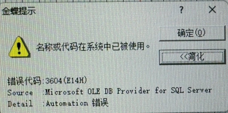 金蝶K3 录入凭证名称或代码在系统中已被使用。 错误代码:3604(E14H)