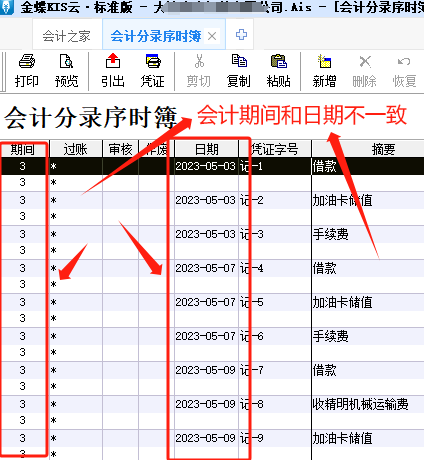 一客户急急忙忙找到我,说金蝶标准版新开的账套,做了好几个月了,发现凭证管理里面的会计期间和日期不一致,记账凭证的日期和不是对应的期间。