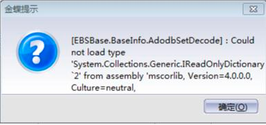 金蝶KIS云旗舰版过程中出现如图所示的弹框提示“[(EBSBase.BaseInfo.AdodbSetDecode] : Could not load type’System.Collections.Generic.IReadOnlyDictionary 2’ from assembly ‘mscorlib,Version=4.0.0.0,Culture=neutral,”