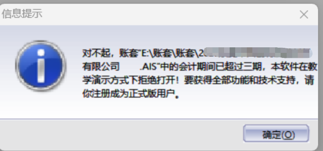 金蝶KIS标准版迷你版提示:对不起会计期间已超过三期,本软件在教学演示方式下拒绝打开!要获得全部功能和技术支持,请你注册成为正式版用户