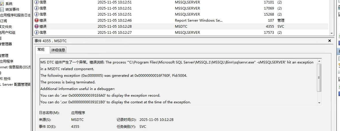 事件查看器里面记录的是DTC Distributed Transaction Coordinator该服务有问题,重启DTC服务,只要一重启服务器,数据库服务必定自动关闭