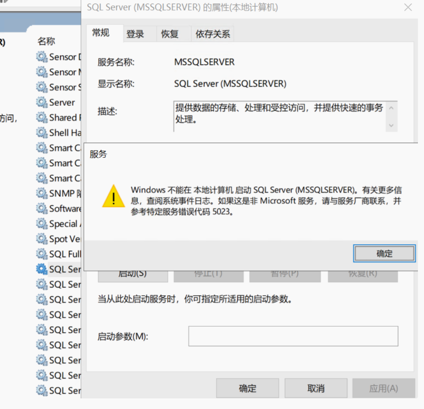 Windows不能在本地计算机启动SQL Server (MSSQLSERVER)。有关更多信息,查阅系统事件日志。如果这是非Microsoft服务,请与服务厂商联系,并参考特定服务错误代码5023。