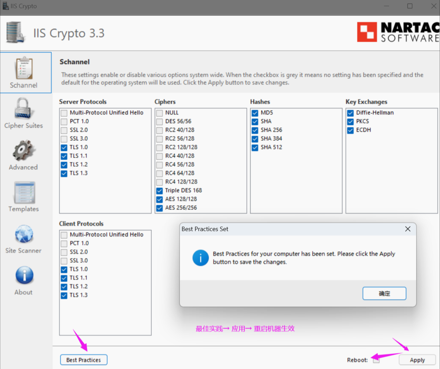 1、使操作系统兼容tls1.0和tls1.1,点击IISCrypto.exe 3.3版本的最佳实践按钮应用并重启机器生效