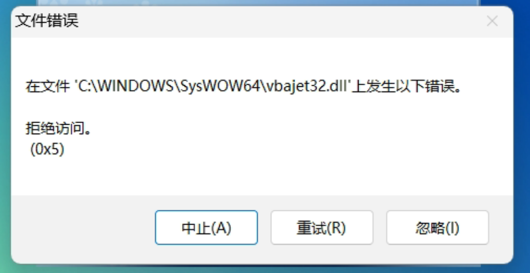 用友T3安装在WIN11 25H2及以上系统报错提示文件错误 在文件’C:\WINDOWS\SysWOW64\vbajet32.dIl上发生以下错误、拒绝访问的解决方案