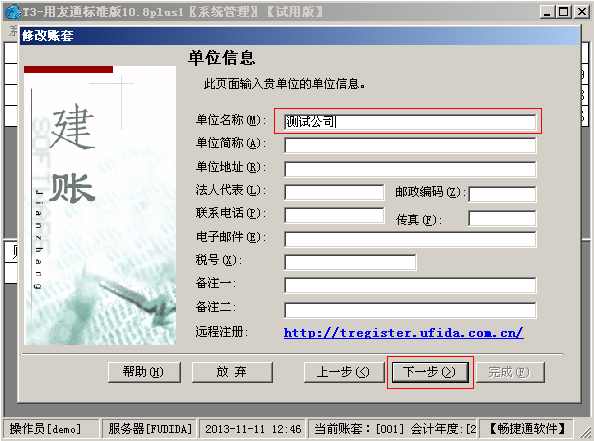 4、在单位信息中将原有单位名称修改成打印凭证时需要显示的单位名称,然后点击下一步